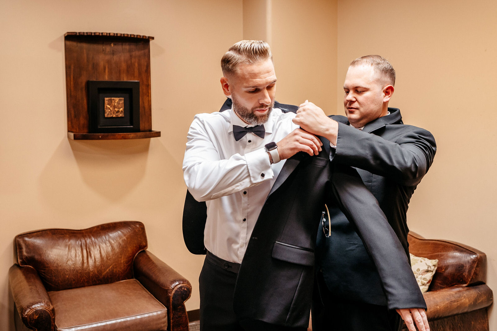 Be Ready but not fully dressed: Whoever is helping the Bride/Groom get dressed, should be fully dressed. The bride usually has hair/makeup almost done and in her robe. We typically capture finishing makeup touches like lipstick/blush, hair accessories, dress, jewelry, shoes, and any other details during the prep. Groom usually has their pant and shirt on. We will capture the Groom’s cuff links, vest, tie, watch, shoes, and any other accessories to be worn before he puts them on.
